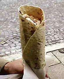 Doner kebab (also döner kebab) (UK: /ˈdɒnər kɪˈbæb/, US: /ˈdoʊnər kɪˈbɑːb/; Turkish: döner or döner kebap [dœˈneɾ ceˈbap]) is a type of kebab, made of meat cooked on a vertical rotisserie.[1] Seasoned meat stacked in the shape of an inverted cone is turned slowly on the rotisserie, next to a vertical cooking element. The outer layer is sliced into thin shavings as it cooks. The vertical rotisserie was invented in the 19th-century Ottoman Empire, and has inspired similar dishes such as the Arab shawarma, Greek gyros, Canadian donair, and Mexican al pastor.[2][3][4]