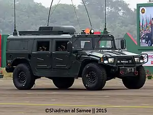 The Dongfeng EQ2050[lower-alpha 2] is a Chinese-made armored vehicle based on the Humvee, manufactured for government use by the Dongfeng Motor Group. It is known to be sold by the company for 700,000 Yuan ($93,000).[4] The vehicle was created after People's Liberation Army (PLA) officials saw the Humvee deployed in the Gulf War. While it is used in the PLA, it has also been exported to friendly countries for military use.