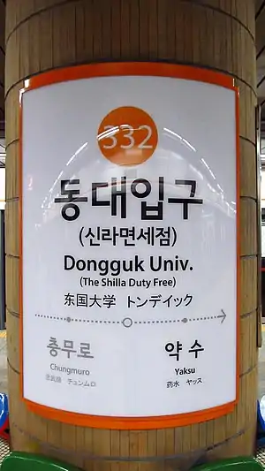 Dongguk University Station is a station on the Seoul Subway Line 3 located in Jangchung-dong 2-ga, Jung-gu, Seoul, Seoul. As its name indicates, it serves the nearby Dongguk University. In addition, Jangchung Gymnasium, an indoor sports arena most famous for hosting ssireum (Korean wrestling) matches on holidays, is outside Exit 5. It is also the closest station to Shilla Hotel.[3]