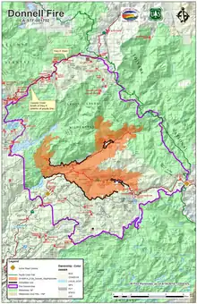 The Donnell Fire was a wildfire that started on August 1, 2018 due to an unknown cause, near Donnell Reservoir, burning around California State Route 108 in Tuolumne County, California and in the Stanislaus National Forest.[3][4][5] It spread rapidly, and the Forest Service closed a California state highway, many forest service roads, campgrounds, wilderness areas, access to privately-owned inholdings, and the Pacific Crest Trail.[6] The fire burned 36,450 acres (147.5 km2), and destroyed 54 major structures and 81 minor structures, before the fire burned out on October 1. There were nine injuries caused by the fire, but no deaths.[1]