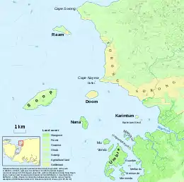 First appearing in Dutch records by 1863 through a study by Heinrich Agathon Bernstein, the island was colonized by the Dutch early in the establishment of Dutch East Indies presence in New Guinea, with a colonial post being officially established in 1906 and a Minahasan being appointed as the head.[3][6] The island later served as an administrative post, with multiple office buildings, a prison, and a "pleasure building" being constructed on the island.[7] A diesel-powered electrical generator was installed on the island to supply electricity for the buildings.[8] The island acted as an administrative center for the onderafdeling (lit. subdivision) of Sorong between 1935 and 1950 or 1952.[3]