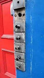 Before electrical doorbells, large houses and estates often had complicated mechanical systems to allow occupants of any room to pull a bell pull and ring a bell at a central bell panel in the staff quarters, to summon a servant.[7]