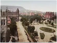 View from the roof of the Windsor Station, showing from left to right, St. George's Cathedral, the Windsor Hotel, Erskine Church, YMCA and the Knox Church