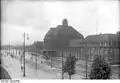 The original Dortmund station was built north of the city centre by the Cologne-Minden Railway Company (Cöln-Mindener Eisenbahn-Gesellschaft, CME) as part of its trunk line and opened on 15 May 1847.[5] Two years later the Bergisch-Märkische Railway Company (Bergisch-Märkische Eisenbahn-Gesellschaft, BME) opened its station as a purely terminating station south of the existing station at the end of its main line to Elberfeld (now Wuppertal),[8] its line to Soest (from 1855)[9] and its Ruhr route to Duisburg and Oberhausen (from 1860).[10] The original station building on an island, with access from the castle gate, was replaced in 1910 by a spacious new building at the current location. The tracks were raised to end the obstacle to road traffic through restricted level crossings. This second Dortmund station was inaugurated on 12 December 1910 and was one of the largest in the German Empire when it opened. The station then received the name "Dortmund Hbf" on 1 October 1912. It was destroyed during the Second World War.[5]