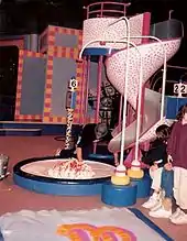 Many obstacles have appeared in the course rotation, often based on body parts, food, and enlarged items found in daily life.[15] Popular elements of the obstacle course have included The One-Ton Human Hamster Wheel, an oversized hamster wheel; Pick It, a giant human nose with a flag hidden inside; The Sundae Slide, a chocolate-covered ramp leading to a playground slide with ice cream at the bottom; and Gum Drop, which required contestants to leap into a giant gumball machine filled with plastic balls and slide out through the dispensing hatch at the bottom.[15][16]