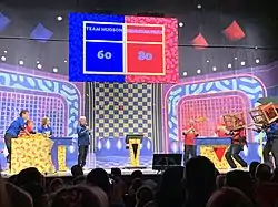 The set, designed by James Pearse Connelly,[98] bore a heavy resemblance to the original set used in the 1980s. Updates included using digital screens for displays and decoration, enhanced lighting, and a dedicated space for the obstacle course, though timing and scoring uses emulation of the original vane display-type numerals.[99] Members of the "challenge team" also appeared as stage assistants, including Eric Pierce, Michelle Kallman, James Michael Ryan Jr., and Stad St. Fleur.[8][100] Edd Kalehoff remixed and re-composed the original theme song and soundtrack for this version.[8]
