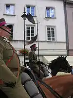 The whip is held upright in the right hand, going back to the tradition where the sword would be held in such a way as a salute. This method is rarely practiced today, although still seen used by the Spanish Riding School, the Escola Portuguesa de Arte Equestre, and the mounted troops of the household cavalry in London, England.