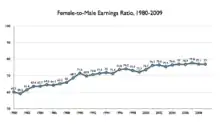The gender wage gap is a possible consequence of occupational segregation. The gender wage gap is the "difference between wages earned by women and men".[23] In 2008, globally, men were estimated to earn 16.5 per cent more than women. The gender wage gap is narrowing, but progress remains slow. Additionally, the narrowing of the gender wage gap may be attributed to a decrease in men's wages instead of an increase in women's wages. "The persistent gender wage gap across regions may reflect a number of factors, including women's continued disadvantage in terms of education and skills; their lack of an organized voice and bargaining power; gender-specific constraints on their labour market mobility; and their relatively high involvement in part-time or temporary jobs."[23] Many characteristics of the labor market constrain the employment opportunities of women and make it easier for them to be responsible for care work.