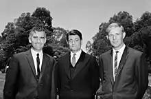 In 1976, during his second term as Deputy Prime Minister, Anthony began a strong import and export relationship with Japan, particularly over oil.[26] Anthony supported the mining and export of Australian uranium, and believed it would be an essential part of the future economy.[27] While Acting Prime Minister in July 1976, he was the first user of the Papua New Guinea–Cairns telephone line, speaking to Acting Prime Minister Sir Maori Kiki.[28] While Acting Prime Minister in July 1979, he threatened to shut down an industrial strike in Western Australia, stating the issue had to be resolved. The Labor Party was strongly opposed to this action and called his power as Acting Prime Minister into question.[29] After Fraser lost office in 1983, Anthony remained as party leader (since 1974 named the National Party). The last major move as leader of the National Party that Anthony made was to explain the tensions between the Liberal and National parties in Queensland, who officially opposed each other in the October 1983 election.[30]