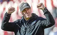 On August 2, 2020, Pederson tested positive for COVID-19 during training camp. He planned to communicate with the team virtually during his quarantine, and he relinquished day-to-day head coaching duties to assistant head coach Duce Staley in the interim.[61] Pederson returned to the team on August 12.[62] In the 2020 season, the Eagles had their 3rd straight year of injuries, mainly on the offensive line. The Eagles reached a record 14 different offensive line combinations during the season. Pederson faced controversy during the Eagles' final game against the Washington Football Team when he pulled quarterback Jalen Hurts out for backup Nate Sudfeld in the third quarter while facing a three-point deficit. Philadelphia subsequently lost 20–14 to finish with a division-worst 4–11–1 record. Although Pederson said the decision was to give Sudfeld the opportunity to play, he was accused of deliberately losing the game to increase the Eagles' draft position.[63][64][65]