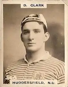 Clark played in Huddersfield's 9–5 victory over Warrington in the 1913 Challenge Cup Final at Headingley Rugby Stadium, Leeds in front of a crowd of 22,754. He also scored a hat-trick of tries in his side's victory in the Championship Final of 1913. Clark played in Huddersfield's 19–3 victory over Bradford Northern in the 1913 Yorkshire Cup Final at Thrum Hall, Halifax on Saturday 29 November 1913. Going on the 1914 Great Britain Lions tour of Australia and New Zealand, he played for in the famous "Rorke's Drift Test" in Sydney when his side won with 11 men.[7] Clark was a member of Fartown's "Team of all talents" which won all four cups in 1915.[8] Clark played in the 31–0 victory over Hull F.C. in the 1914 Yorkshire Cup Final at Headingley Rugby Stadium, Leeds on Saturday 28 November 1914. Clark played in the 37–3 victory over St. Helens in the 1915 Challenge Cup Final at Watersheddings, Oldham on Saturday 1 May 1915 in front of a crowd of 8,000. Clark played in the 35–2 victory over Leeds in the 1914–15 Northern Rugby Football Union season's Championship Final.