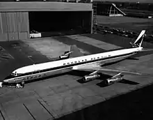 Donald Douglas proposed to build and test the DC-8 at Santa Monica Airport, which had been the birthplace of the DC-3 and home to a Douglas plant that employed 44,000 workers during World War II. To accommodate the new jet, Douglas asked the city of Santa Monica, California to lengthen the airport's 5,000-foot runway. Following complaints by neighboring residents, the city refused, so Douglas moved its airliner production line to Long Beach Airport.[3] The first DC-8 N8008D was rolled out of the new Long Beach factory on 9 April 1958 and flew for the first time, in Series 10 form, on 30 May for two hours seven minutes with the crew being led by A.G. Heimerdinger.[4]
