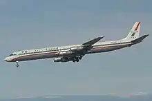 - DC-8 Series 62: The long-range Series 62 followed in April 1967. It had a more modest stretch, two 40-inch (1.0 m) plugs fore and aft of the wing taking overall length to 157 feet 5 inches (47.98 m), and a number of modifications to provide greater range. 3 feet (0.91 m) wingtip extensions reduced drag and added fuel capacity, and Douglas redesigned the engine pods, extending the pylons and substituting new shorter and neater nacelles, all in the cause of drag reduction. The 18,000 lb JT3D-3B was retained but the engine pylons were redesigned to eliminate their protrusion above the wing and make them sweep forward more sharply, so that the engines were some 40 inches (1.0 m) further forward. The engine pods were also modified with a reduction in diameter and the elimination of the -50 and -61 bypass duct. The changes all improved the aircraft's aerodynamic efficiency. The DC-8 Series 62 is slightly heavier than the -53 or -61 at 335,000 pounds (151,953 kg), and able to seat up to 189 passengers, the -62 had a range with full payload of about 5,200 nautical miles (9,600 km; 6,000 mi), or about the same as the -53 but with 40 extra passengers. Many late production -62s had 350,000 pounds (158,760 kg) maximum takeoff weight and were known as the -62H.[20] Also available as the cargo door equipped convertible -62CF or all cargo -62AF. Production included 51 DC-8-62s, 10 -62CFs, and 6 -62AFs.[15][4]