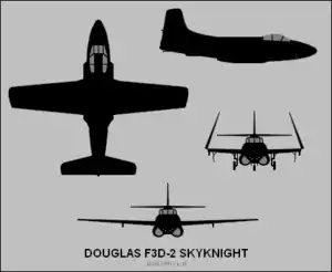 The Douglas F3D Skyknight (later designated F-10 Skyknight) is an American twin-engined, mid-wing jet fighter aircraft manufactured by the Douglas Aircraft Company in El Segundo, California. The F3D was designed as a carrier-based all-weather night fighter and saw service with the United States Navy and United States Marine Corps. The mission of the F3D was to search out and destroy enemy aircraft at night.[1]