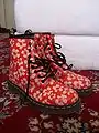 The first Dr. Martens boots in the United Kingdom, with an eight-eyelet cherry red coloured smooth leather design known as style 1460 and still in production today, although in many variations, were introduced on 1 April 1960. The three-eyelet shoe arrived exactly one year later with the style number 1461 (1/4/61). Dr. Martens boots were made in their Cobbs Lane factory in Wollaston, Northamptonshire, where they continued to be made, in addition to production elsewhere, until at least 2018.[5][7] In addition, a number of shoe manufacturers in the Northamptonshire area and further afield produced the boots under licence, as long as they passed quality standards. The boots were popular among workers such as postmen, police officers and factory workers. By the later 1960s, skinheads started to wear them, "Docs" or "DMs" being the usual naming, and by the late 1970s, they were popular among scooter riders, punks, some new wave musicians, and members of other youth subcultures.[8] The shoes' popularity among politically right-wing skinheads led to the brand gaining an association with violence.[8] Alexei Sayle sang the song "Dr. Martens' Boots" in a 1982 episode of the British TV comedy The Young Ones.[9]