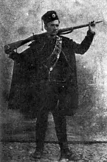 As a graduate of Zajecar gymnasium, Stojadinović contacted fellow countrymen in Belgrade, members of the University Association of Bloodbrothers who recruited young people to liberate the Christian population in Old Serbia, then under Ottoman occupation. At the age of 19 in the spring of 1905, he left with voivode Doksim Mihailović to across the Ottoman-occupied border and participated in the Fight on Čelopek. After this fight, he continued as a freedom-fighter in the Kumanovo area under the command of Đorđe Skopljanče and later in the Veles and Prilep region under the voivodes Rade Radivojević, Jovan Babunski and Vasilije Trbić until 1908. In the skirmish with Bulgarians in the village of Drenovo near Makedonski Brod[6] on 14 June 1907, he shot the rifle off the hands of VMRO voivode Stefan Dimitrov. After 1908 he enrolled in law school studies, which he completed in good time. In 1911, as a famed crack shot, he was chosen by the French rifle club l'Union des Tireurs Serbes in Belgrade to participate in a European rifle shooting competition in Rome where he took first prize. He defended the title until 1914. In the wars of 1912 up until 1918, he participated as a reserve officer in the 13th Hajduk Veljko Infantry Regiment. During the Balkan wars, he became more involved in recording the bellicose events as a photographer and cinematographer. After the war, he published a photo album of photographs from the Balkan wars and the Arnaut rebellion. By order of the Supreme Command in 1916, he became head of the Cinematographic Section of the Supreme Command of the Serbian Army. Many important war events were recorded due to the outstanding organization of Serbian war photographers and cameramen who were under his watch. After the war, he still continued to record important happenings and events.[7][8]