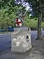 The dragon boundary marks are cast iron statues of dragons on metal or stone plinths that mark the boundaries of the City of London. The dragons are painted silver, with details of their wings and tongue picked out in red. The dragon stands on one rear leg, the other lifted against a shield, with the right foreleg raised and the left foreleg holding a shield which bears the City of London's coat of arms, painted in red and white. This stance is the equivalent of the rampant heraldic attitude of the supporters of the City's arms.