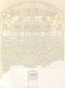 The Dream Stele is a rectangular stele made of granite, 3.6 metres (12 ft) tall and weighing 15 tons. It originally formed the back wall of a small open-air chapel built by Thutmose IV between the paws of the Sphinx.[2] It was rediscovered in 1818 during Giovanni Battista Caviglia's clearance of the Sphinx.[3] The stele itself is a reused door lintel from the entry to the mortuary temple of Khafre as pivot sockets on the back of the stele match those at the threshold of the temple.[2]