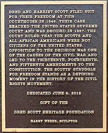 - 2006, a new historic plaque was erected at the Old Courthouse to honor the roles of both Dred and Harriet Scott in their freedom suit and its significance in U.S. history.[25]