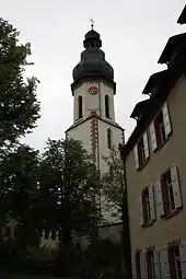 The so-called Läutturm (bell tower) belonged to the medieval St. Georgen Church, of which nothing has survived. Between 1689 and 1822 the tower remained only as a stump. In 1818, the Sprinkhorn et Schrader foundry in Frankenthal cast a three-voiced bell that proved to be too large for the ridge turret of the Trinity Church built in 1717. Threfore, the bell tower was rebuilt to accommodate the new bell. On July 2, 1891, the tower burned including the clock and bells. In the same year Andreas Hamm poured a new bell from Frankenthal with the tones of the C minor triad (c1, es1 and g1), which were thus tuned to the bell of the cathedral. They bore the inscriptions "God's Word Remains for Eternity", "There Is Still Rest in the People of God" and "Rejoice in the Lord All Ways". First they were hung up in a bell house on the church garden and after the reconstruction of the bell tower they had to be ringable; in 1917 the bells had to be collected for war purposes. This was followed in 1924 by three bells from the same foundry, this time in the tones c1 (emergency bell), es1 (faith bell) and f1 (sky bell). In the Second World War, this bell was destroyed.[12] Since 1951, the Vaterunserglocke (Lord's Prayer bell) has hung in clay b1 in the ridge turret of the Dreifaltigkeitskirche itself; it was cast by Friedrich Wilhelm Schilling. In 1964, the Karlsruher Glocken- und Kunstgießerei cast three bells for the bell tower with the same striking tones as the first bell (C minor triad).[13]