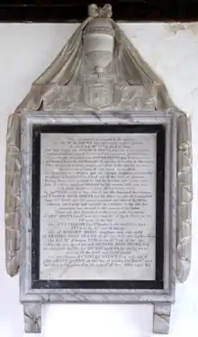 His mural monument survives in Broadhembury Church, erected after 1801 as requested in the will[28] of his eldest son and heir Francis Rose Drew (1738–1801), and displays a triple impalement: centre: (Ermine, a lion passant gules) Drew; dexter: (Sable, on a pale or three roses slipt leaved proper) Rose;[29] sinister: (Argent, a chevron between three lion's heads erased gules crowned or) Johnson. It is inscribed as follows (before much biographical details of some of his progeny):