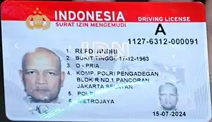 Indonesian Driving License (Indonesian: Surat Izin Mengemudi, abbreviated as SIM) is a legal document required in Indonesia before they are allowed to drive a motor vehicle. The Indonesian driving license is issued by the Indonesian National Police (Polri). The general requirements for a license in Indonesia are to be at least 17 years old (for A-class; different age requirement exist for each class), pass the theory test, and pass the practical test.