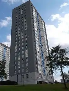 ![]() Aerial view of central Drumchapel (2017), with the local secondary school surrounded by expanses of unused land following the demolition of substandard housing, with modern houses and refurbished tenements also in view | |