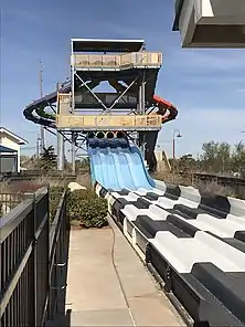 The tower features three slides that are individually colored and named. According to the Park Policy, guests must meet height and weight requirements and use a rider tube to enjoy these three slides.[5]