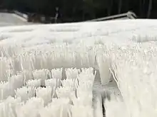 The next stage in dry ski slope development came with the brush industry. The most common material is Dendix[1] which is a by-product of brush manufacturing and is similar to a short-haired brush with the bristles sticking upwards. Dendix is manufactured in Chepstow, however it can be found on slopes throughout the world.[2] It is arranged in a hexagonal pattern of approximately 1-inch (25 mm) strips of bristles in a 4 in (100 mm) hexagon. Although it was a significant advancement from previous surfaces, concern over damage to slope users (it provides little or no impact protection to a slope user when falling) and ski or snowboard damage due to friction meant litigation for slopes using it was a constant threat. Nowadays water is often sprayed onto the surface of the dendix to lubricate it and increase speed; however, higher insurance premiums cause many slope operators to look for safer alternatives.[3]