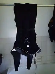 Surface dry suits may have socks or ankle seals fitted. Socks are normally made from latex rubber or from a breathable material similar to the rest of the suit. An outer boot or shoe would normally be worn over these socks to protect them from wear and the risk of puncture. The outer boot also provides more warmth than the thin layer of latex. A regular sock (e.g. a woollen sock) would normally be worn inside the drysuit sock for comfort.[20] Latex rubber ankle seals are sometimes fitted in place of socks and can allow better foot control of water skis and surfboards. Survival suits may have neoprene socks of the same material as the suit, with tougher soles and ankle ties to keep them on the feet, as the "one-size fits all" socks must be too big for most users.[21][22]
