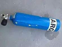 Normally, the gas used for dry suit inflation is air from the primary breathing cylinder. Helium-based gas mixes such as trimix or heliox are avoided for suit inflation because of helium's high thermal conductivity. Nitrox blends from a decompression cylinder have essentially the same thermal conductivity as air but oxygen rich mixes introduce a fire hazard when out of the water. Using a small (1-2 litre), dedicated cylinder avoids these complications; usually this will contain air but argon may be used instead. Argon has a low thermal conductivity, which improves insulation by approximately 20% compared to air,[7]:24 without adding any bulk or weight. Unfortunately, the accidental breathing of pure argon results in rapid unconsciousness and probable death. Consequently, argon cylinders must be clearly marked to prevent the accidental attachment of a breathing regulator or have valves that cannot accept a breathing regulator. To gain the full benefit of argon the suit must be flushed with argon before the dive to remove the air.[25][26]