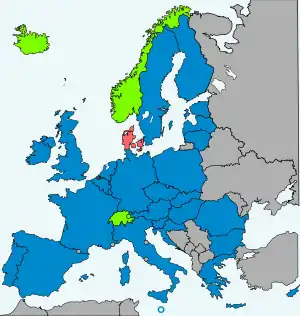 The Dublin II Regulation was adopted in 2003, replacing the Dublin Convention in all EU member states except Denmark, which has an opt-out from implementing regulations under the area of freedom, security and justice.[1] An agreement with Denmark on extending the application of the Regulation to Denmark came into force in 2006.[4] A separate protocol also extended the Iceland-Norway agreement to Denmark in 2006.[5] The provisions of the Regulation were also extended by a treaty to non-member states Switzerland on 1 March 2008,[6] which on 5 June 2005 voted by 54.6% to ratify it, and Liechtenstein on 1 April 2011.[7] A protocol subsequently made this agreement also applicable to Denmark.[8]