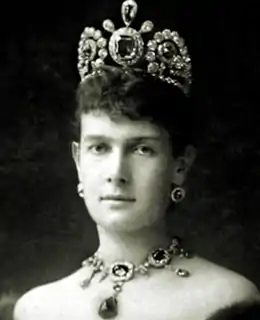 Grand Duchess Maria Pavlovna "Miechen" of Russia (Russian; Мари́я Па́вловна; born Duchess Marie Alexandrine Elisabeth Eleonore of Mecklenburg-Schwerin; 14 May [O.S. 2 May] 1854 — 6 September 1920), better known as Maria Pavlovna the Elder, was the eldest daughter of Grand Duke Frederick Francis II of Mecklenburg-Schwerin by his first wife, Princess Augusta Reuss of Köstritz. A prominent hostess in Saint Petersburg following her marriage in 1874 to the Grand Duke Vladimir Alexandrovich of Russia, she was known as the "grandest of the grand duchesses"[1] and had an open rivalry with her sister-in-law the Empress Maria Feodorovna.