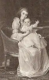 Sophia Frederica, known as Sofie Frederikke af Mecklenburg-Schwerin in Denmark, was described as jolly, charming and intelligent.[1] She had a hard time in the beginning adapting to her new, stiffer environment, but became quite popular.[2] During the first ten years of her marriage (1774-1784), she gave birth to three daughters, the eldest two were stillborn and the third lived only five months;[3][4][5] it was only in 1786 when she had the first of her living children, the future King Christian VIII.