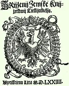 The Duchy of Teschen (German: Herzogtum Teschen), also Duchy of Cieszyn (Polish: Księstwo Cieszyńskie) or Duchy of Těšín (Czech: Těšínské knížectví, was one of the Duchies of Silesia centered on Cieszyn (Teschen) in Upper Silesia. It was split off the Silesian Duchy of Opole and Racibórz in 1281 during the feudal division of Poland and was ruled by Silesian dukes of the Piast dynasty from 1290 until the line became extinct with the death of Duchess Elizabeth Lucretia in 1653.[1]