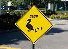 While ducks are generally aware of their surroundings and possible dangers, they are not immune to accidents. The increasing number of fatalities on roads led to concern within many local towns and communities. Aside from specific man made crossings, a duck crossing may also refer to a wider area used as a route ducks often take to cross roads. These are marked off by "duck crossing signs" similarly to other caution oriented road markings (school zones, blind corners, etc.).
