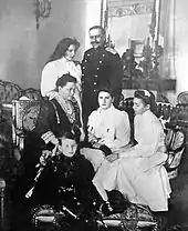 Georg Alexander fell in love with his mother’s lady in waiting Natalia Feodorovna Vanljarskya (16 May 1858 - 14 March 1921), the daughter of Fedor Vanliarsky, a Russian State Councillor, who served in the Ministry of Finance. She was a member of the Russian nobility who came from Germany in 17th century whose name was originally von Lahr.[6] Vanljarskya was a skillful singer and the couple was brought together by their shared passion for music.[7] Grand Duchess Catherine Mikahilovna opposed their union and fired Natalia, hoping that his son would forget the affair and would marry a bride of royal background. However Georg Alexander persisted and in June 1889 he went to Germany to obtain the permission to marry from the head of the family, his uncle, Grand Duke Frederick William (1819-1904). With his uncle’s consent, George Georgievich married Natalia Vanliarskya on 14 February 1890 in St. Petersburg.[1] As Natalia was not of member of reigning royal family their union was treated as morganatic and she received from the Duke of Mecklenburg-Strelitz the title of Countess von Carlow (the name Carlow came from the estate Karlivka in Poltava province, that belonged to Georg-Alexander) that would pass to their children.[6] Their marriage was a happy one and Natalia eventually became loved by her husband’s family.[7]