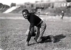 Slater played college football at the University of Iowa from 1918 to 1921.[3] Playing the tackle position on the line, he was a first team All-American in 1921[4] and a member of the Hawkeyes’ 1921 national championship team. Slater joined the NFL the following year, becoming the first black lineman in league history.[5] He played ten seasons in the NFL for the Rock Island Independents and the Chicago Cardinals, garnering seven all-pro selections.[6]