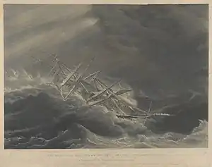 The East India Ship 'Duke of Buccleuch', (Captn Alexr Henning) in a Hurricane off the Mauritius, attempting to wear; George Philip Reinagle, Edward Duncan, & W.J. Wade – National Maritime Museum, Greenwich