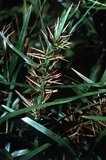 Dulichium is a monotypic genus of sedge containing the single species Dulichium arundinaceum, which is known by the common name threeway sedge. This is an aquatic or semi-aquatic plant of the lakes, streams, and ponds of the United States and Canada It has a wide distribution across the two countries, though noticeably absent from the Dakotas and from the Southwestern Deserts.[1][2][3][4][5]