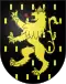 The blazon of the municipal coat of arms is Sable semee of Billets Or, a Lion rampant crowned Or langued Gules.[6]