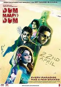 Dum Maaro Dum (transl. Hit a puff) is a 2011 Indian Hindi-language action thriller film[3][4] directed by Rohan Sippy and starring Abhishek Bachchan and Bipasha Basu in the lead roles, with Rana Daggubati, Prateik Babbar and Aditya Pancholi in supporting roles. It was shot in Goa. Deepika Padukone makes a special appearance in the remix version of the hit song "of the same name".[5] The music has been composed by Pritam. This is the first time a Bollywood film has been mixed in Dolby 7.1 Surround Sound.