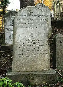 The Jewish portion of the cemetery is located close to South Road in the lower part of the cemetery, and contains around 180 burials, with the earliest being from 1863.[5] A large proportion of New Zealand's early Jewish immigrants are buried in the cemetery's Jewish section,[6] with members of many of New Zealand's more notable Jewish families — including the Hallensteins, Theomins, Joels, and De Beers — among those interred.