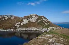 Dunlough Castle is a series of three fortified towers, or keeps, which stand almost invisibly upon the isthmus connecting “Three Castles Head” with the mainland. The only route of access is from the south across private farm land. The towers are connected by a wall spanning more than one hundred feet from the western cliffs to the shores of an apparently man-made lake. The wall is mostly fallen today; yet in places it stands approximately 15 feet (4.6 m). At the eastern shore of the lake, a wall from the same period serves as a dam, preventing the lake's water from pouring over the cliffs into Dunmanus Bay several hundred feet below. Passage around the eastern shore of the lake is awkward; while the castle and wall block the western shore. A small footpath between the westernmost ruins and the 400-foot (120 m) cliffs allows access to the towers and rocky cliffs beyond. As one writer has observed, "To an invading army, the cliff’s edge, the defensive wall, the lake and the sternly inaccessible approach would have made the castle appear impregnable." [1] It is not known if Dunlough was ever attacked.[2]