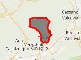 Duno is a comune (municipality) in the Province of Varese in the Italian region Lombardy, located about 60 kilometres (37 mi) northwest of Milan and about 14 kilometres (9 mi) northwest of Varese. Duno borders the following municipalities: Brissago-Valtravaglia, Casalzuigno, Cassano Valcuvia, Cuveglio, Mesenzana, Porto Valtravaglia.