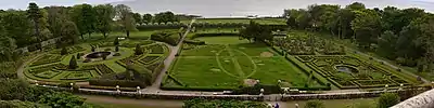 The French influence extends into the gardens, completed in 1850, with Barry taking inspiration from the French formal style of the Gardens of Versailles.[22] Each parterre is set around a circular pool with a fountain, with the essential layout the same since it was created in around 1848.[10][23] Barry designed the parterre as an optical illusion, seen from above they appear to stretch beyond their physical layout, by narrowing it gradually.[12] The total landscaped area is 1,379 acres (558 ha).[15]