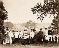 Geoffrey Fowell (1852-1929) was a director of Barclays Bank and Mayor of Norwich in 1903.[12] He was born in 1852. He was the third son of Thomas Fowell Buxton of Easneye Mansion[13] (now All Nations Christian College) near Ware, Hertfordshire. In 1874 he gained a Bachelor of Arts Degree and the University of Cambridge. He married Mary Harbord, daughter of Rev John Harbord in 1878.[14] The couple had nine children, eight of whom are shown in the photograph.