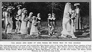 - Captain Halliday, 11th Hussars, supported the bridegroom as best man. Among the many guests invited to the wedding were Florence Lady Nunburnholme, Lord and Lady Nunburnholme, the Earl and Countess of Chesterfield, Earl and Countess Cowley, Lord Suffield, the Earl and Countess of Leicester, the Dowager Countess of Leicester, Lord and Lady Hastings, Mr. and Mrs. Reginald McKenna, and Lord and Lady Hillingdon. After the reception the Hon. Guy and Mrs. Wilson left for their honeymoon, which they are spending on the Continent."[15]