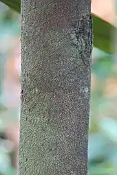 D. graveolens is a large tree, sharing many features with D. dulcis.[1] It inhabits the upper canopy, growing up to 50 m (160 ft) tall.[5][12] The trunk is 85–100 cm (33–39 in) in diameter and can have no branches until about 25 m (82 ft) high.[5] The trunk will be smooth or flaky, grey/mauve to ruddy brown with steep buttress roots.[5] The buttresses reach 3 m (9.8 ft) and extend out 1.5 m (4 ft 11 in).[12]