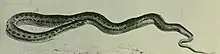 It is pale buff or sandy gray dorsally, with three or five series of regular brown spots. The spots in the vertebral series are broader than long. A V-shaped brown mark is found on the back part of the head, with a diagonal brown streak from behind the eye towards the corner of the mouth. Ventrally, it is whitish.